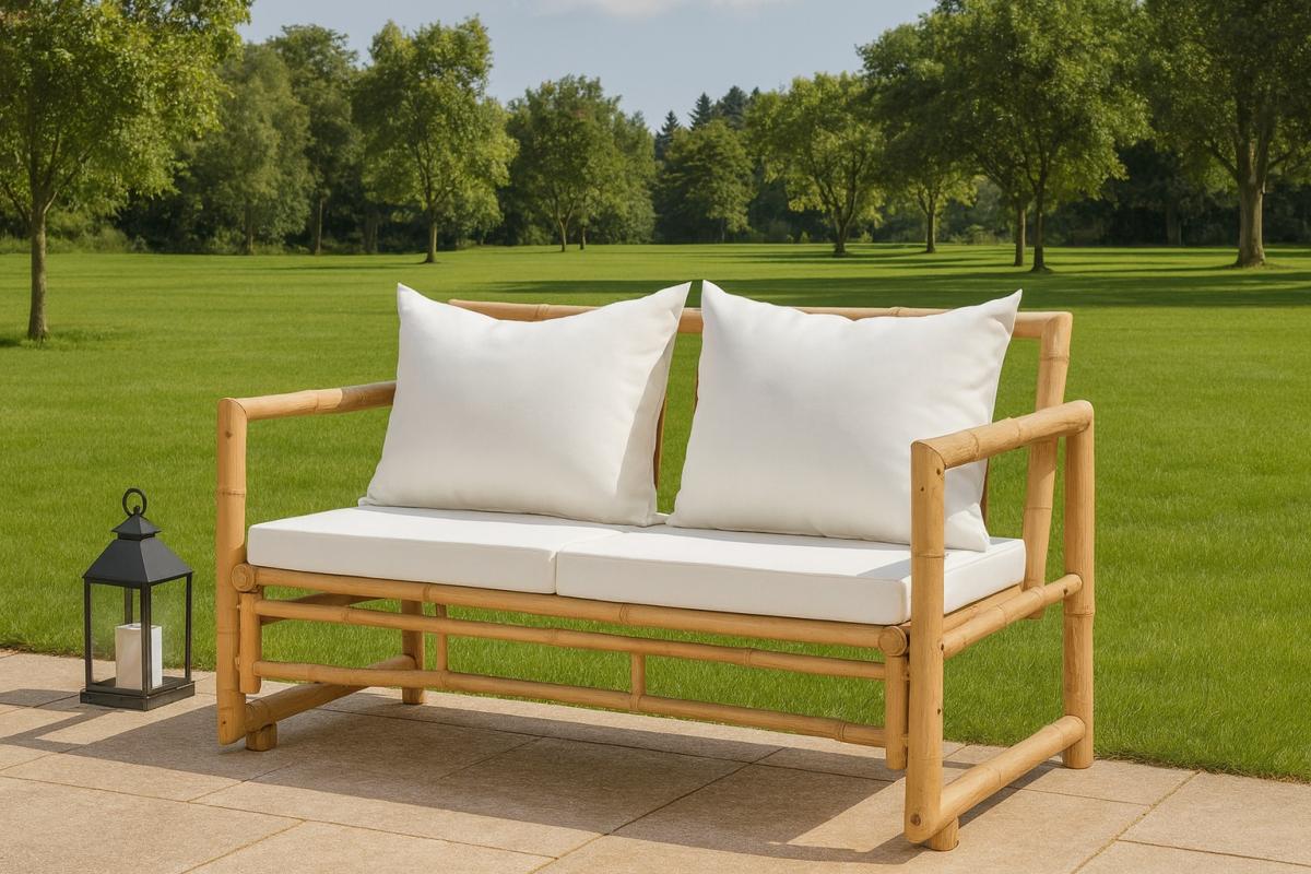 Fabriqué en bambou massif, un matériau durable et résistant aux intempéries, ce banc vous garantit solidité et longévité. Il est livré avec des coussins rembourrés épais pour un confort supérieur : 5 cm pour l’assise et 13 cm pour le dossier. Leur tissu crème apporte une touche lumineuse et chaleureuse à l’ensemble.