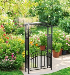 Cette pergola en métal noir de 216 cm, avec ses 2 portillons sera du plus bel effet  dans votre jardin ou à l'entrée de votre terrasse.